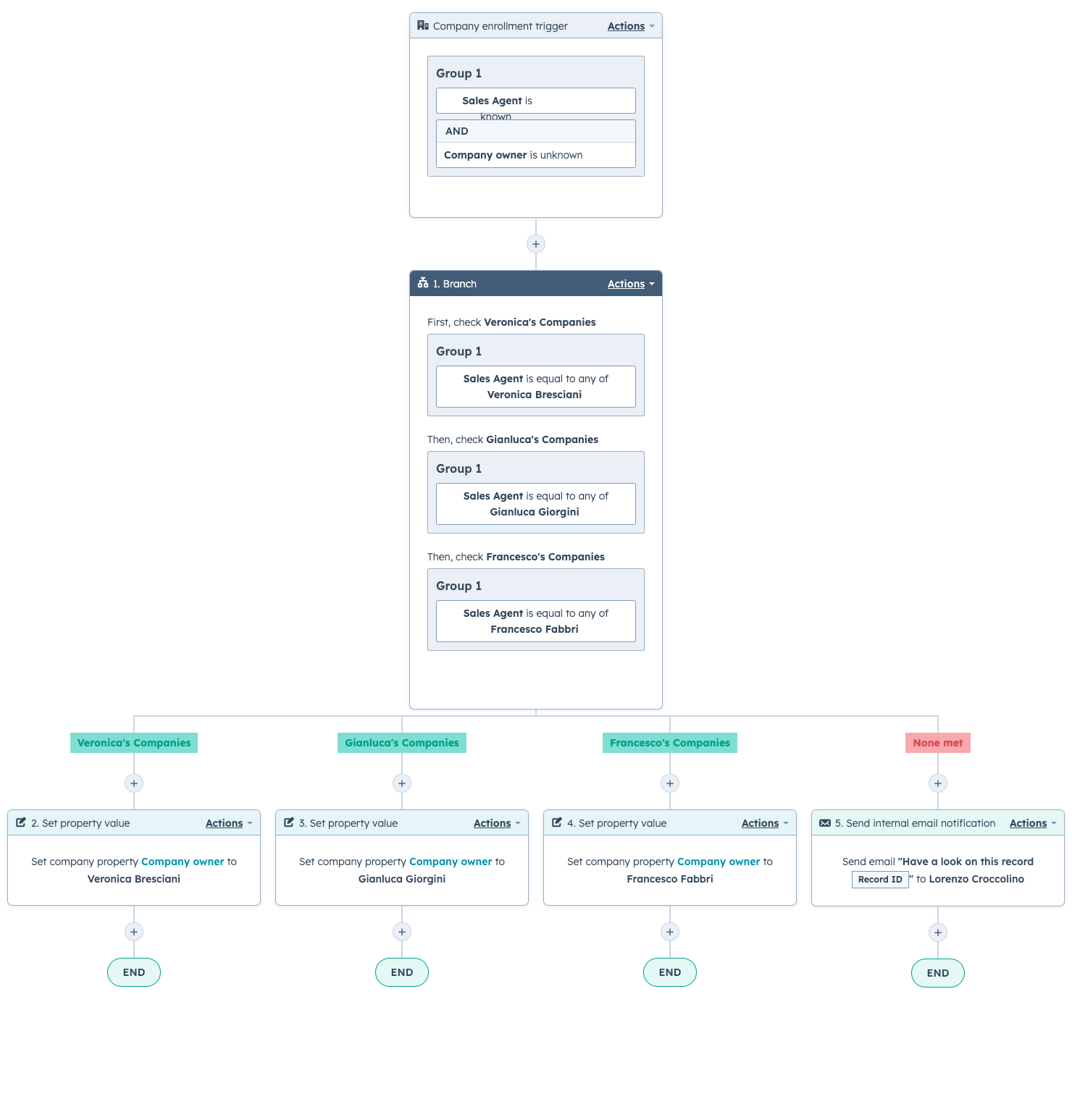 One of the tips we propose is to create a workflow that automatically attributes the agent - field imported from the ERP in HubSpot as single-line text, to the corresponding user on HubSpot. In this case as an input trigger of the workflow you will have the property 'Sales Agent', a property integrated from the ERP. If it is populated and the company owner is unknown, the company will be assigned to the HubSpot user set from the Workflow.