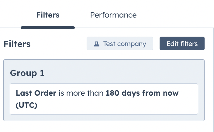 Then create a list of sleeping customers, insert as filter the property "last order" to manage who is entering or not in the selection. In our example we decide to insert all the companies with an order older than 180 days. For active customers the filter would be the contrary, less than 180 days.
