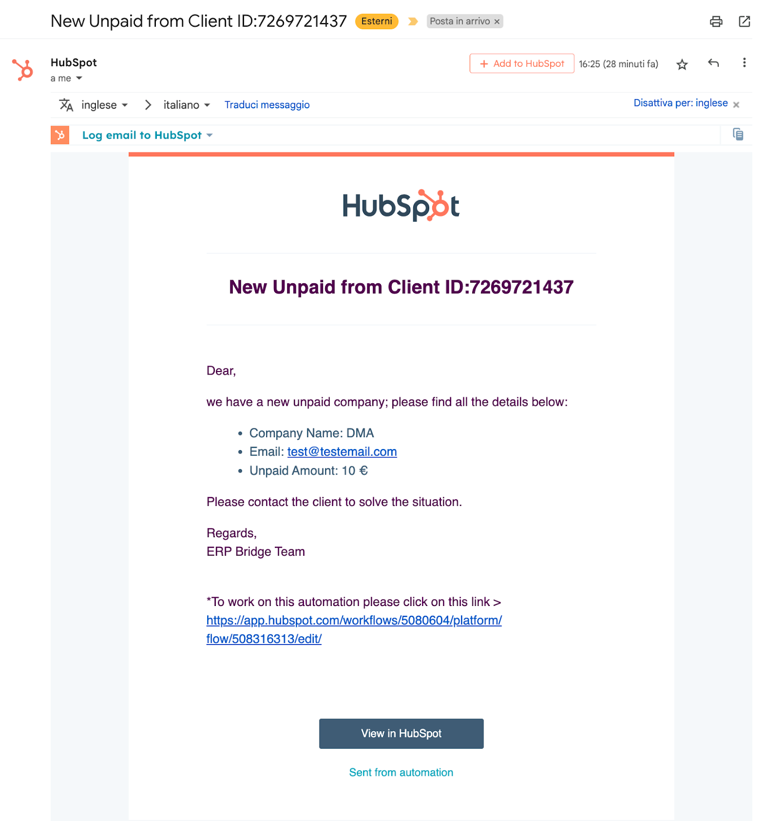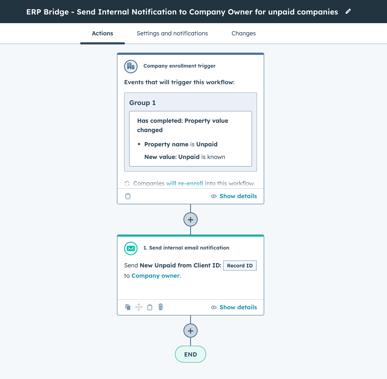 As you can see from the image above, the automation shows as enrollment trigger every changes on the property "Unpaid" that is syncronized from ERP Bridge, and every time it will send automatically an internal email notification to the company owner of that record.