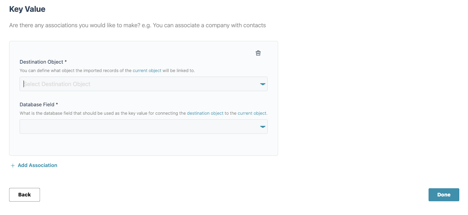 In the Associations section for the Companies object, the advice is to leave the fields empty and click on Done.