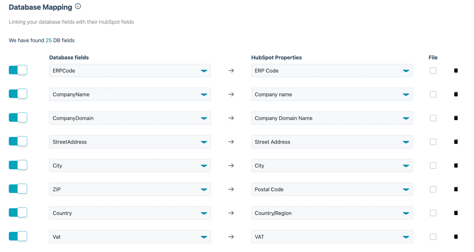 In the Database Mapping section you decide which fields to connect from the SQL view to HubSpot.